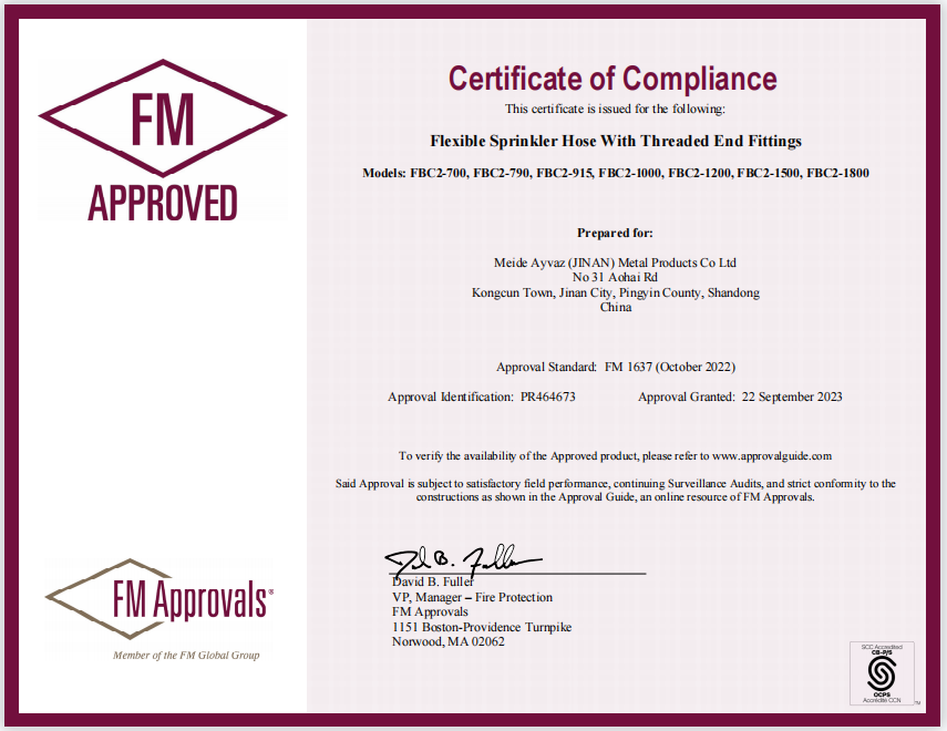 Meide Group FBC2 series flexible hose with new design inlets, new outlets, new brackets, quick-installation center brackets and 80" square tubes has been approved by FM