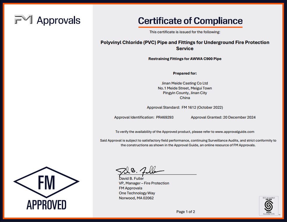 Polyvinyl Chloride (PVC) Pipe and Fittings for Underground Fire Protection Service,Restraining Fittings for AWWA C900 Pipe has been approved by FM