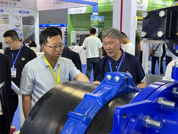 許多參展者慕名前來咨詢大口徑鋼管柔性連接技術,玫德展位人流絡繹不絕。