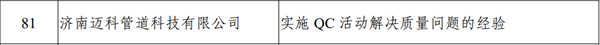近日,山東省工業和信息化廳公示了2024年全省質量標桿典型經驗名單,經企業申報、有關部門推薦、專家論證等程序,濟南邁科管道科技有限公司《實施 QC活動解決質量問題的經驗》成功入選。