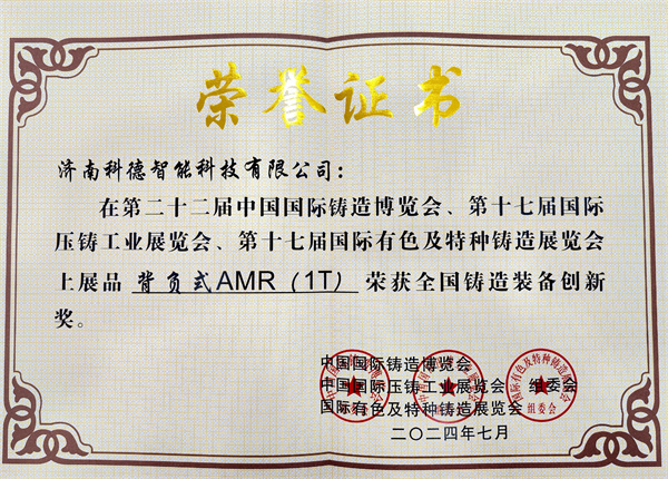 2.濟南科德智能科技有限公司展品“背負式AMR(1T)”榮獲全國鑄造裝備創新獎。
