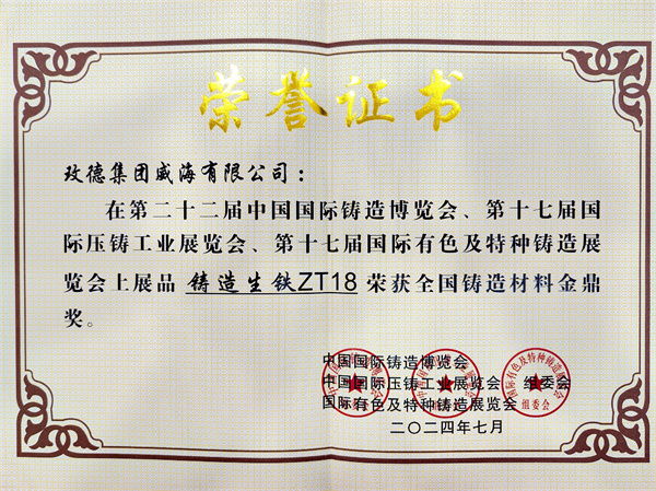 4.玫德集團威海有限公司展品“鑄造生鐵ZT18”榮獲全國鑄造材料金鼎獎。