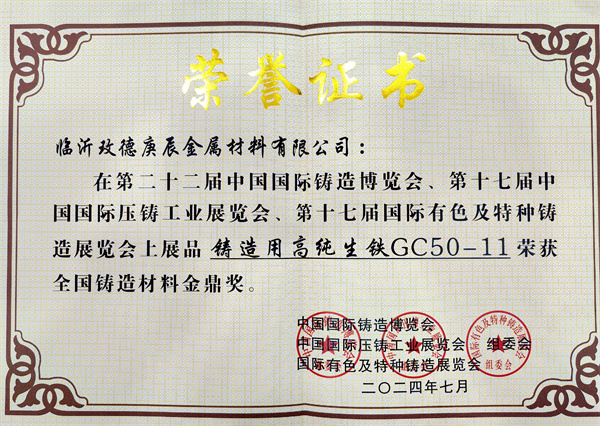 3.臨沂玫德庚辰金屬材料有限公司展品“鑄造用高純生鐵GC50-11”榮獲全國鑄造材料金鼎獎。