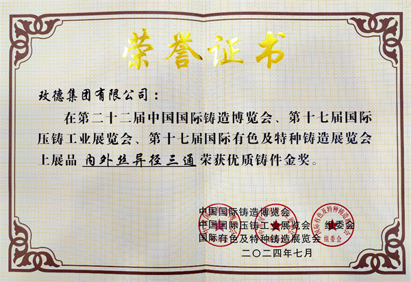 1.玫德集團有限公司展品“內外絲異徑三通”榮獲優質鑄件金獎。