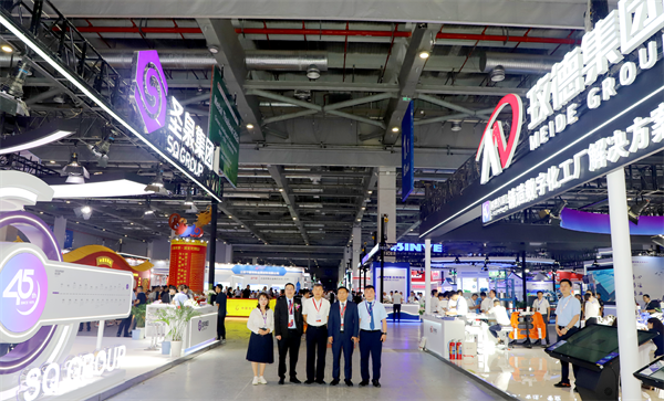 濟南圣泉集團股份有限公司總裁唐地源、煙臺勝地汽車零部件制造有限公司總裁張寶芝蒞臨玫德展位參觀考察,玫德集團董事局主席孔令磊與其共同探討玫德集團智能制造以及數字化工廠解決方案。