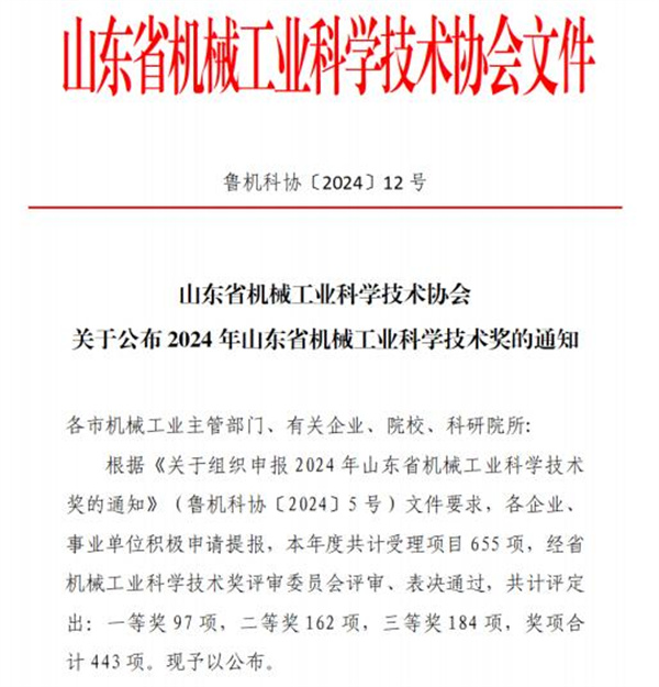 山東省機械工業科學技術獎是省部級科研成果獎,是由山東省機械工業科學技術協會設立的,每年評選一次,旨在選出成果技術創新性突出、技術經濟指標先進、具備顯著應用推廣效益,在推動機械工業科學技術進步等方面有重大貢獻的科技項目,具有較高的含金量。