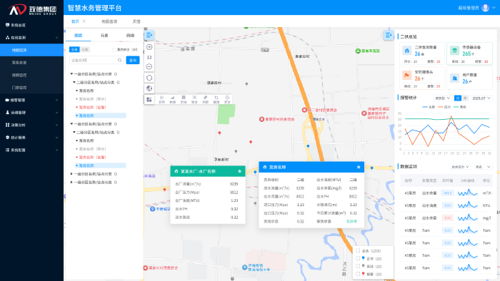 平臺通過歷史數據分析建立預測模型,實現設備異常、水質波動的分級預警,并支持一鍵生成多維度運行分析報告。可在設備完全失效前識別潛在故障,使維護人員能夠提前介入處理,避免突發停機導致的供水中斷,降低應急維修成本。